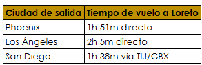 La mejor opción es el puente CBX hacia el aeropuerto de Tijuana, seguido de un vuelo directo de 1 hora y 38 minutos a Loreto.